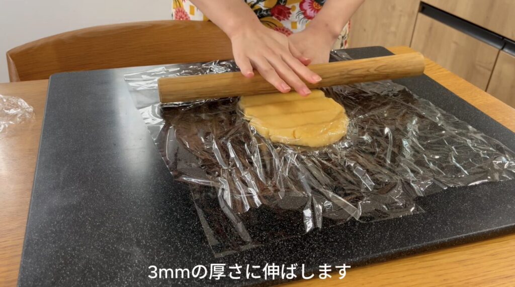 生地を冷蔵庫から取り出し、3mmの厚さになるようにめん棒で伸ばします。