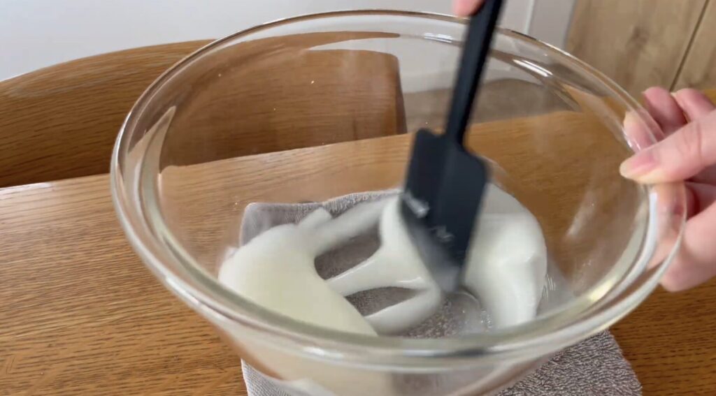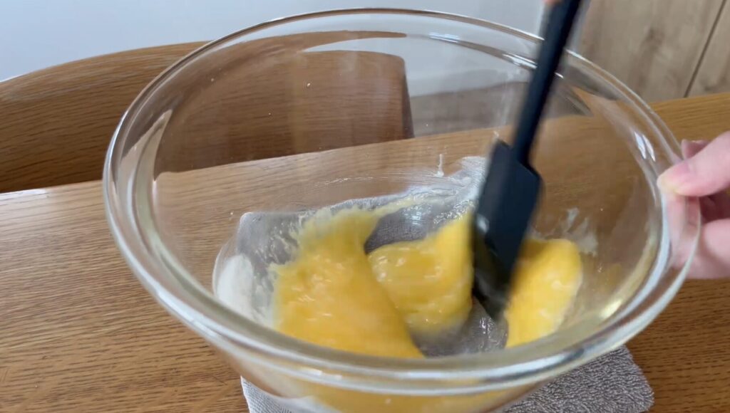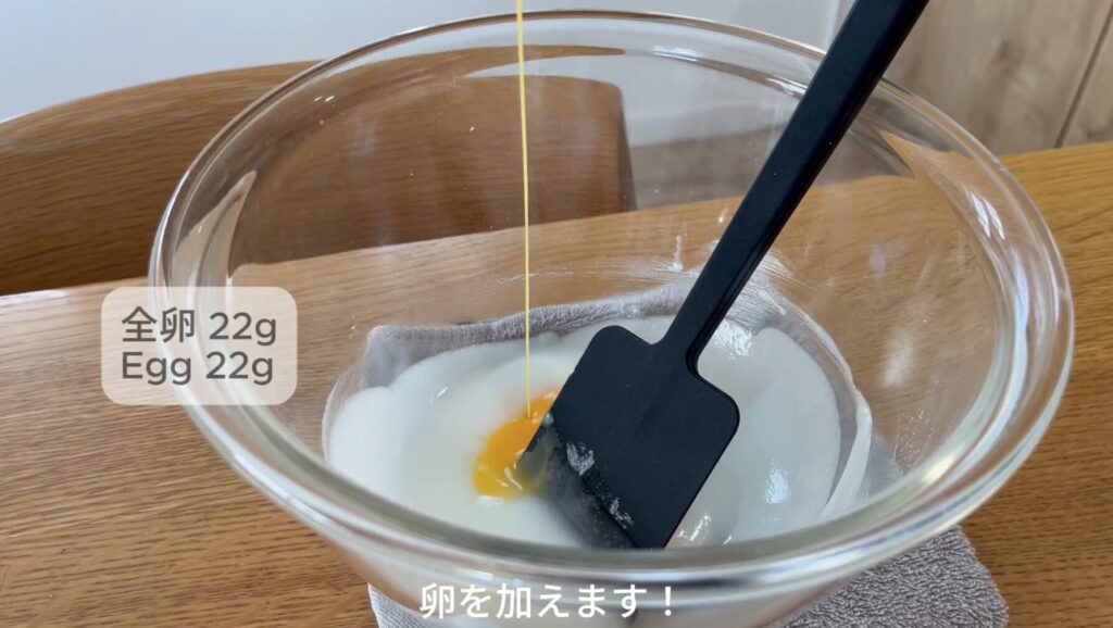 溶き卵を一度に加えて、ゴムベラでさらに混ぜます。