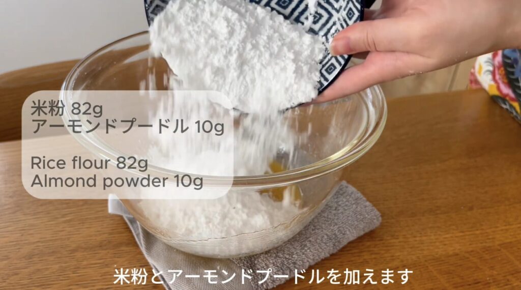 米粉、アーモンドプードルを加えてゴムベラで混ぜます。